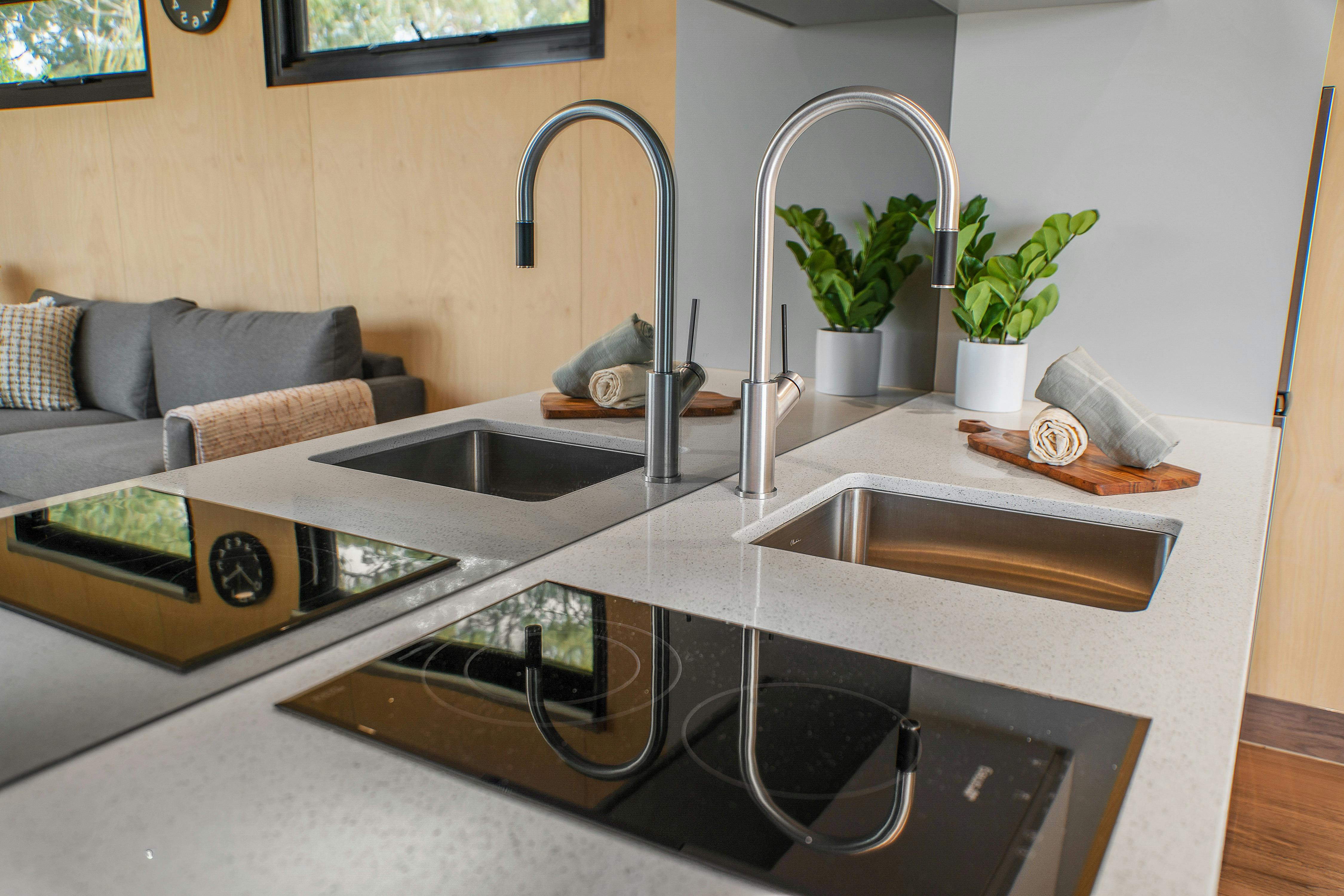 Our brand new modern villas boast an enviable position, perched at the top of our park, overlooking stunning George's Bay. The open plan living/kitchen area features a couch, TV, bar fridge, reverse cycle air-con, and a fully fitted kitchen with microwave, and two burner electric stove. The bedroom features a modern ensuite and Queen bed. Our villas are perfect for a couples retreat or midweek getaway.